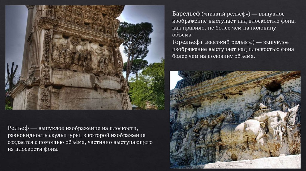 Барельеф («низкий рельеф») — выпуклоеизображение выступает над плоскостью фона,
