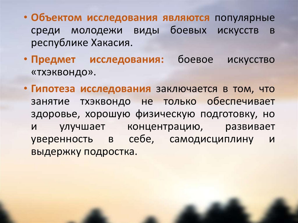 • Объектом исследования являются популярныесреди молодежи виды боевых искусств в