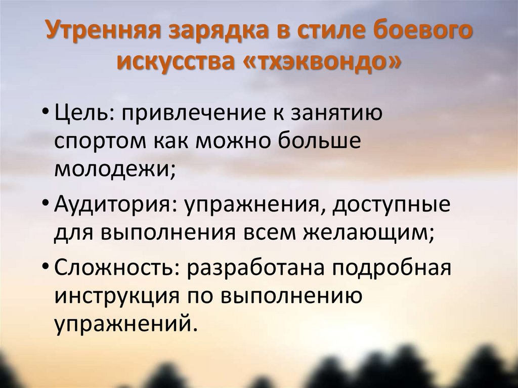 Утренняя зарядка в стиле боевогоискусства «тхэквондо»
