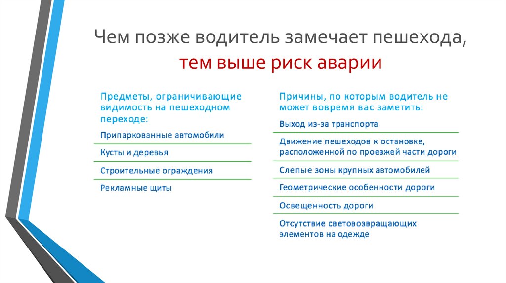 Чем позже водитель замечает пешехода,тем выше риск аварии