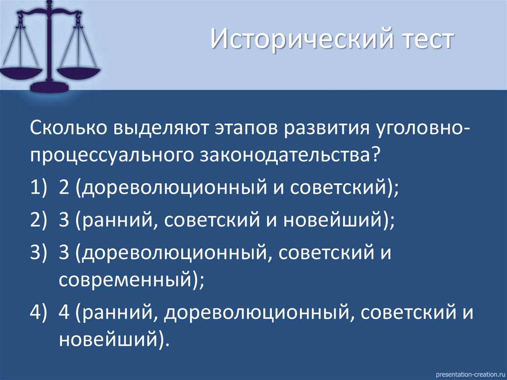 Исторический тестСколько выделяют этапов развития уголовнопроцессуального законодательства?