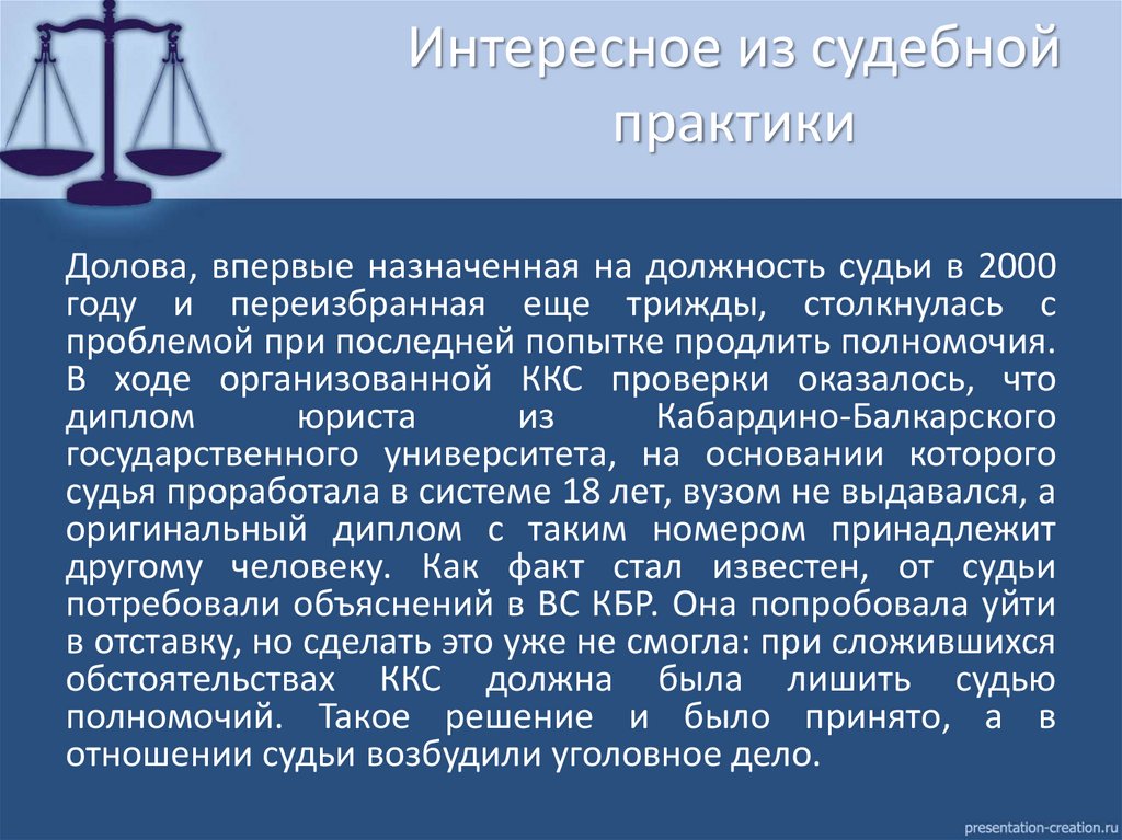 судья проработала в системе 18 лет, вузом не выдавался, а