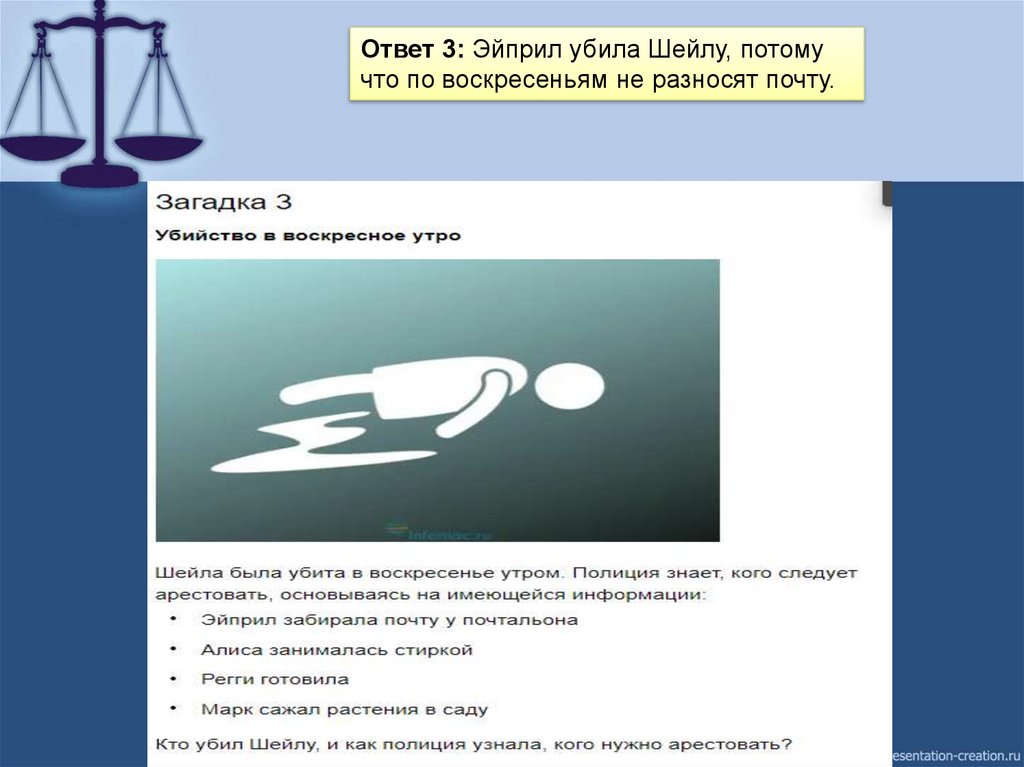 Ответ 3: Эйприл убила Шейлу, потомучто по воскресеньям не разносят почту.