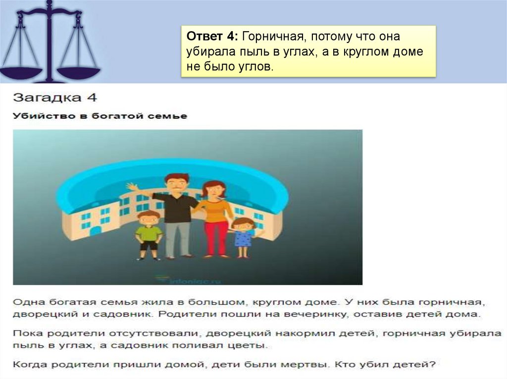 Ответ 4: Горничная, потому что онаубирала пыль в углах, а в круглом доме
