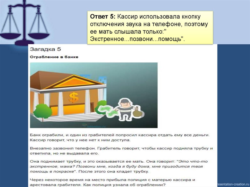 Ответ 5: Кассир использовала кнопкуотключения звука на телефоне, поэтому