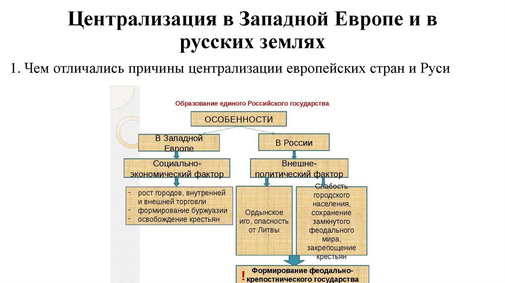 1. Чем отличались причины централизации европейских стран и Руси