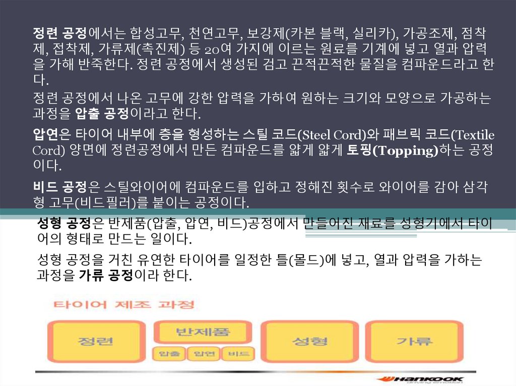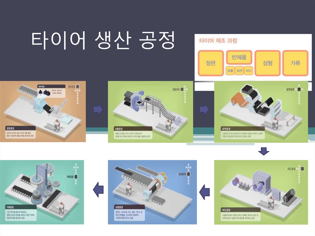 정련 공정에서는 합성고무, 천연고무, 보강제(카본 블랙, 실리카), 가공조제, 점착제, 접착제, 가류제(촉진제) 등 20여 가지에 이르는 원료를 기계에 넣고 열과 압력