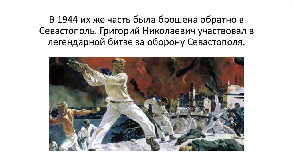 В 1944 их же часть была брошена обратно вСевастополь. Григорий Николаевич участвовал в