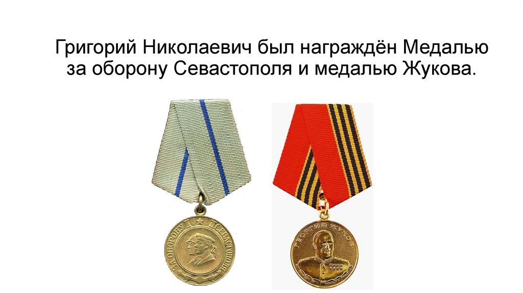 Григорий Николаевич был награждён Медальюза оборону Севастополя и медалью Жукова.