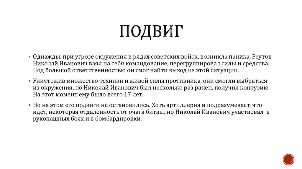Однажды, при угрозе окружения в рядах советских войск, возникла паника, РеутовНиколай Иванович взял на себя командование, перегруппировал силы и средства.