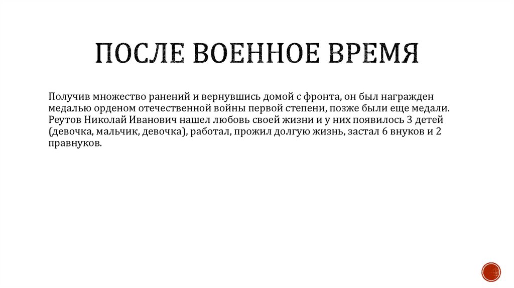 Получив множество ранений и вернувшись домой с фронта, он был награжденмедалью орденом отечественной войны первой степени, позже были еще медали.