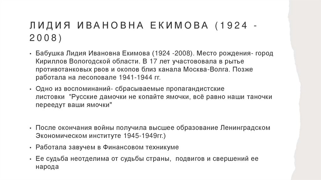 ЛИДИЯ ИВАНОВНА ЕКИМОВА (1924 2008)Бабушка Лидия Ивановна Екимова (1924 -2008). Место рождения- город