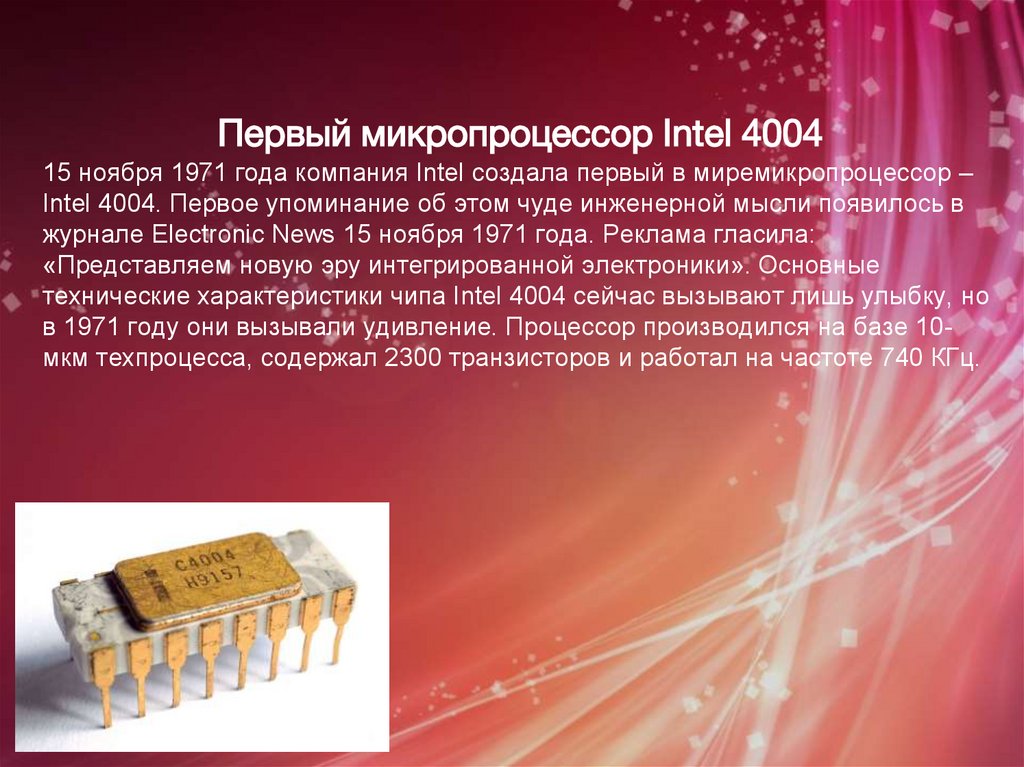 технические характеристики чипа Intel 4004 сейчас вызывают лишь улыбку, но