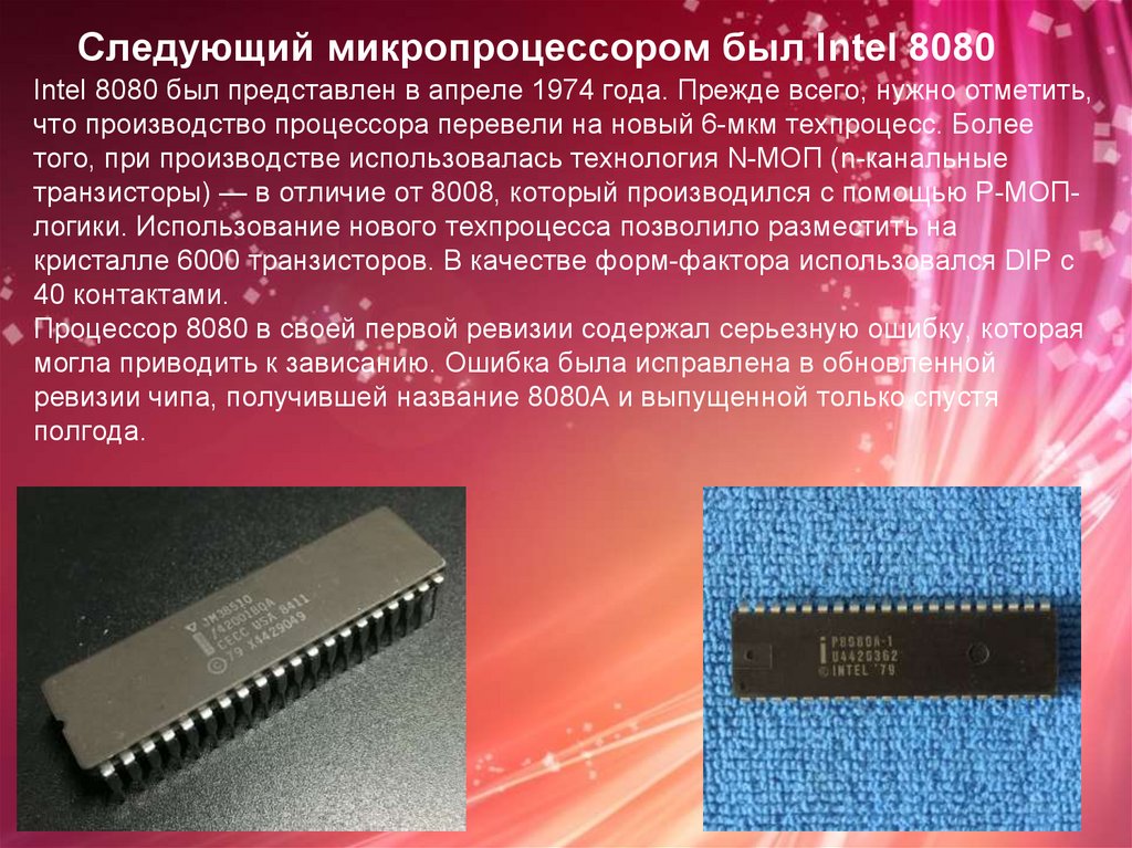 Следующий микропроцессором был Intel 8080Intel 8080 был представлен в апреле 1974 года. Прежде всего, нужно отметить,