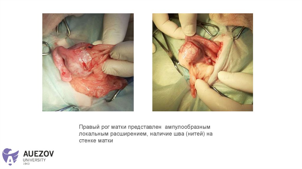 Правый рог матки представлен ампулообразнымлокальным расширением, наличие шва (нитей) на