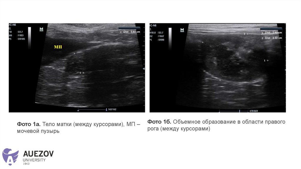 Фото 1а. Тело матки (между курсорами), МП –мочевой пузырь