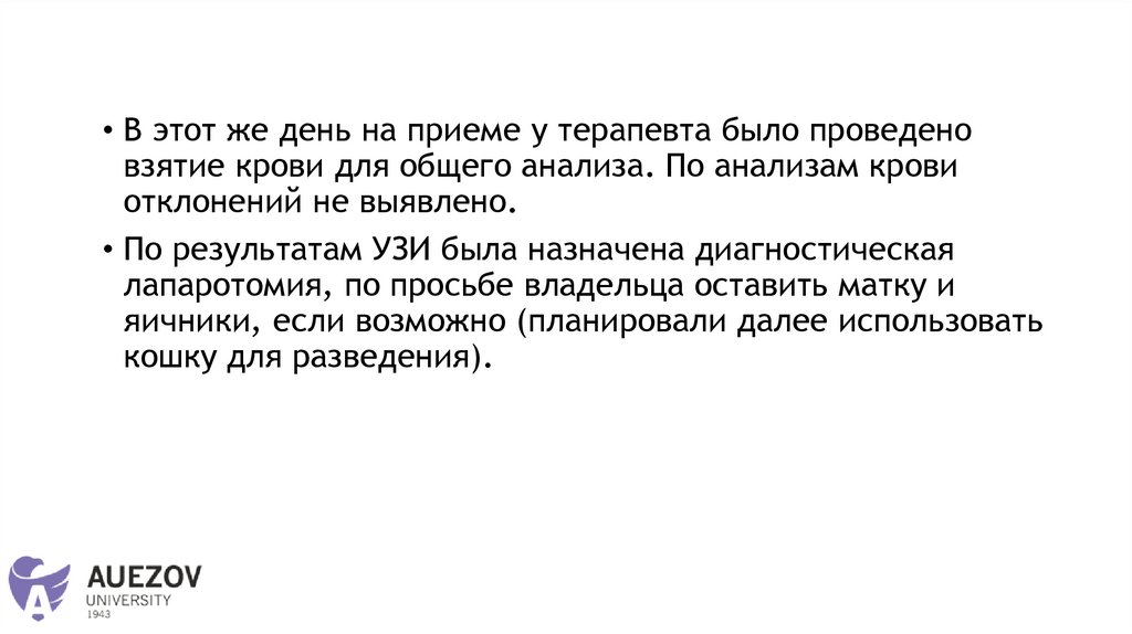 • Пациент переведен в стационар для послеоперационной стабилизации синфузионная терапией. Осложнений в ходе операции и анестезии не