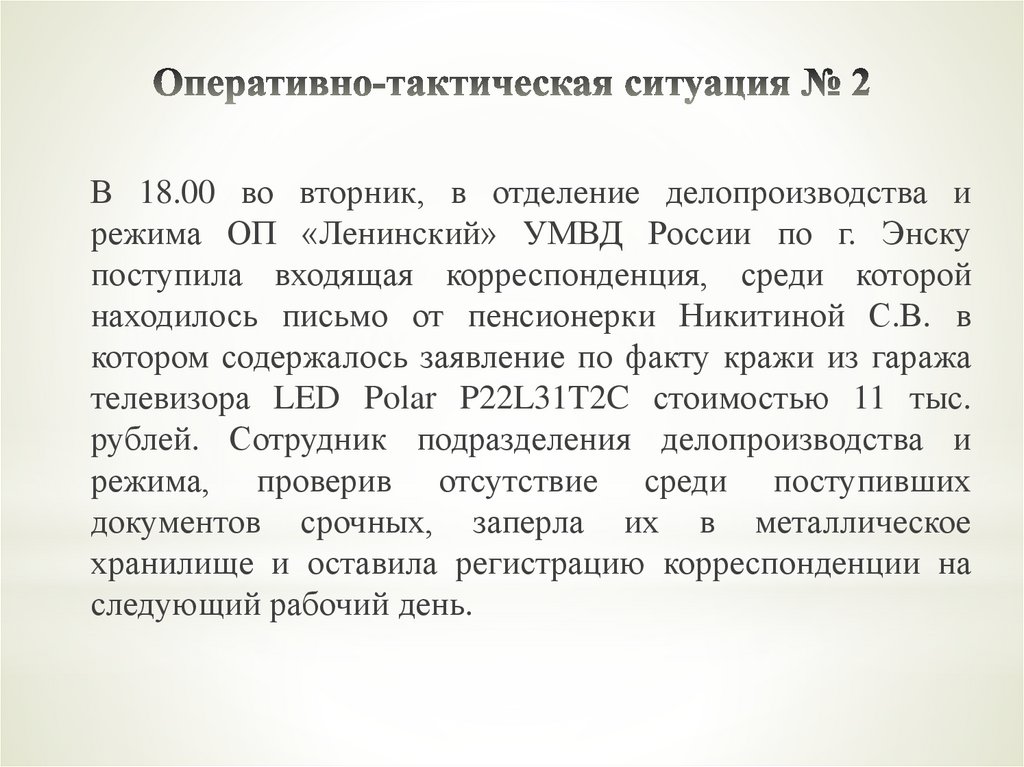 В 18.00 во вторник, в отделение делопроизводства ирежима ОП «Ленинский» УМВД России по г. Энску