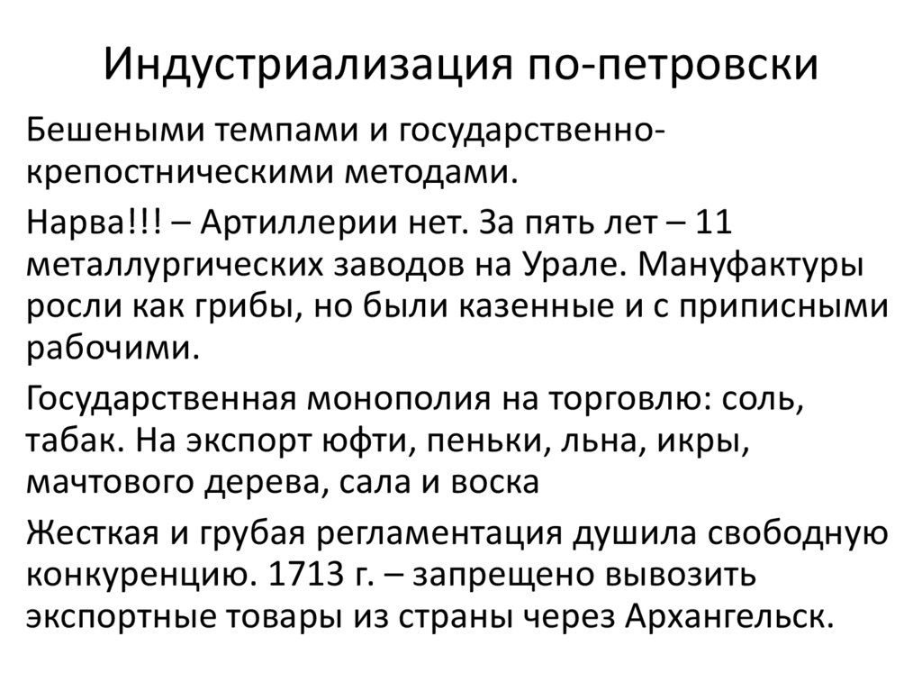 Индустриализация по-петровскиБешеными темпами и государственнокрепостническими методами.