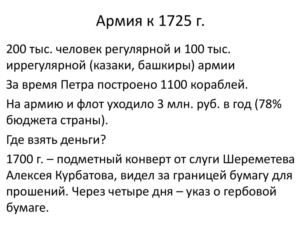 Армия к 1725 г.200 тыс. человек регулярной и 100 тыс.