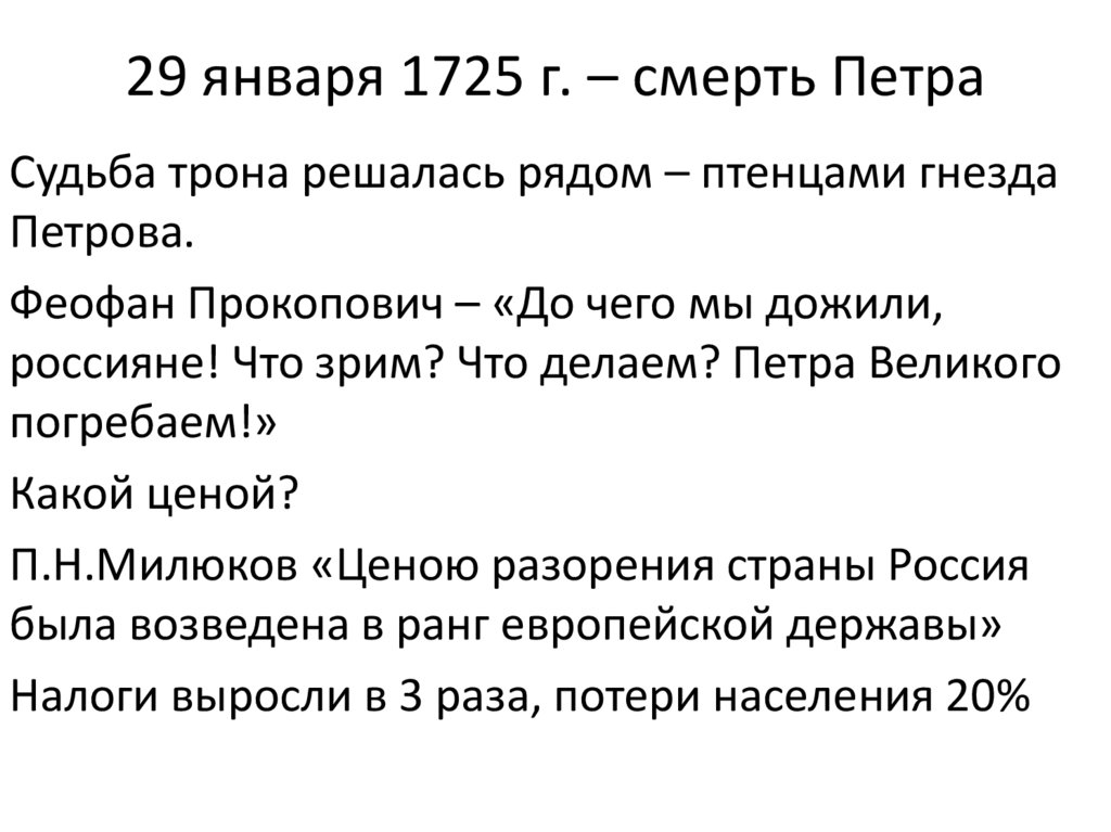 29 января 1725 г. – смерть ПетраСудьба трона решалась рядом – птенцами гнезда