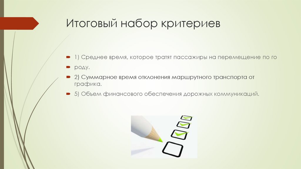 Итоговый набор критериев1) Среднее время, которое тратят пассажиры на перемещение по го