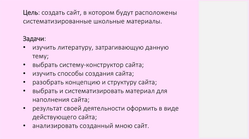 Цель: создать сайт, в котором будут расположенысистематизированные школьные материалы.