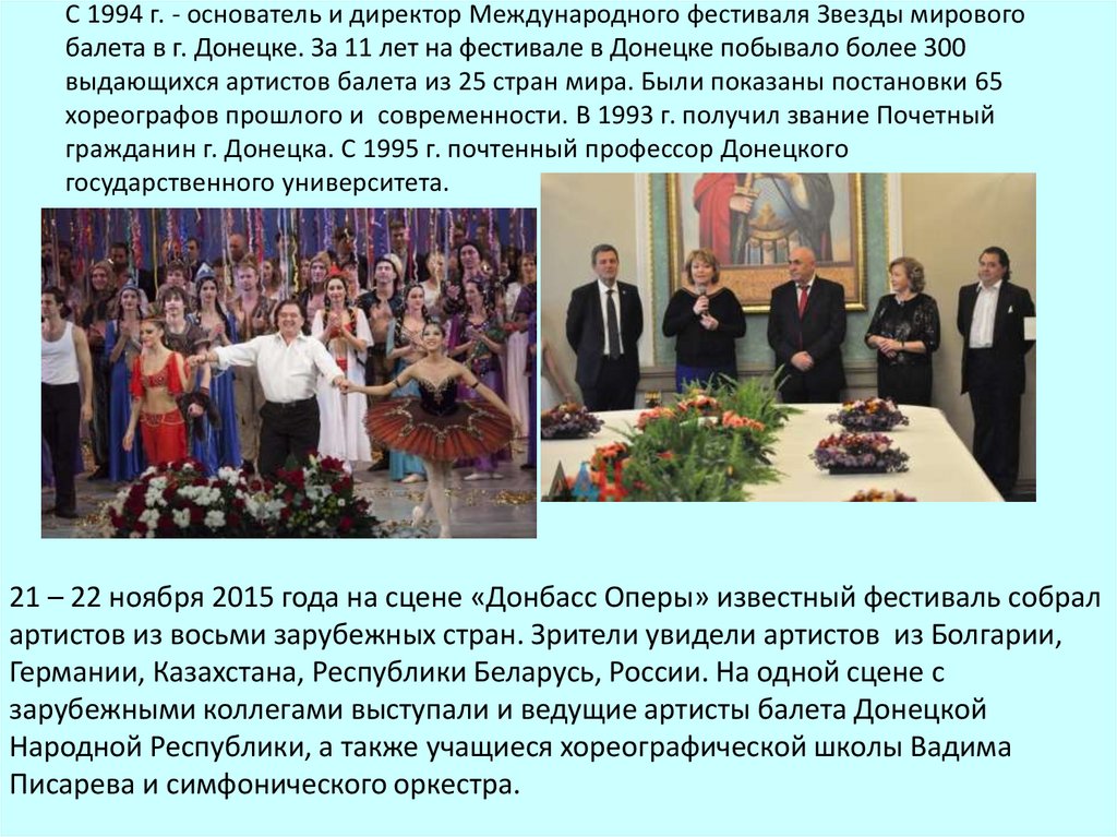 С 1994 г. - основатель и директор Международного фестиваля Звезды мировогобалета в г. Донецке. За 11 лет на фестивале в Донецке побывало более 300