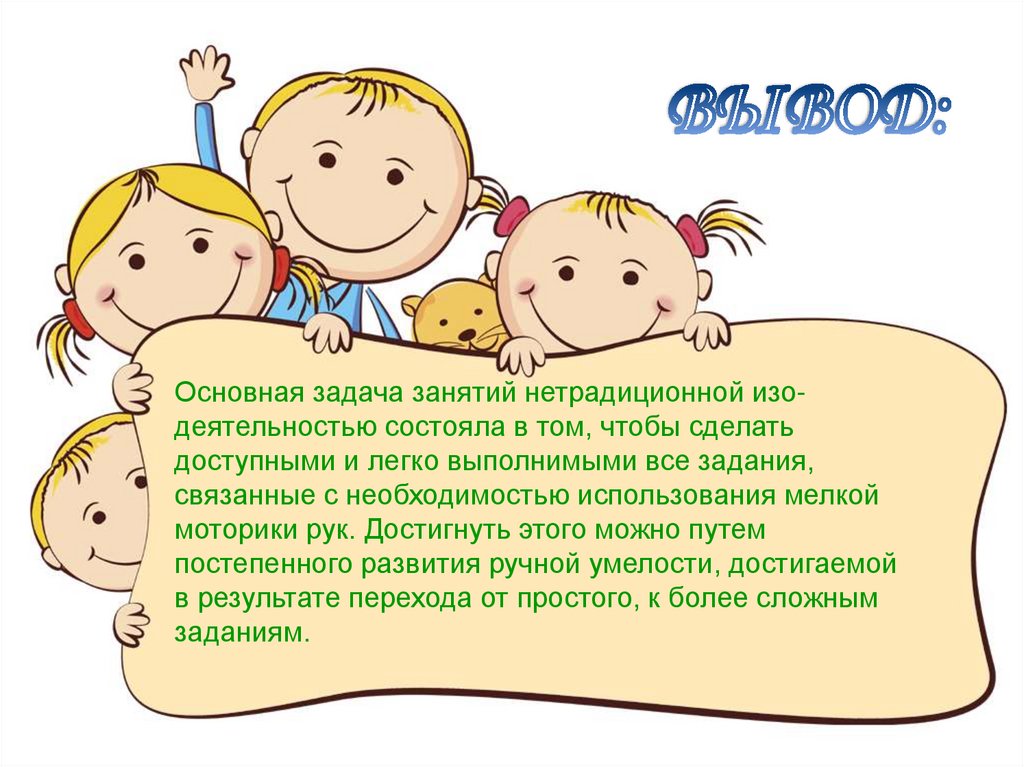 Основная задача занятий нетрадиционной изодеятельностью состояла в том, чтобы сделатьдоступными и легко выполнимыми все задания,
