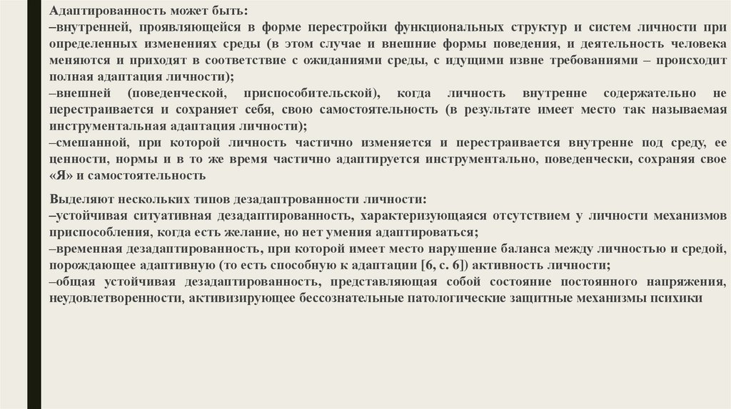 Адаптированность может быть:–внутренней, проявляющейся в форме перестройки функциональных структур и систем личности при