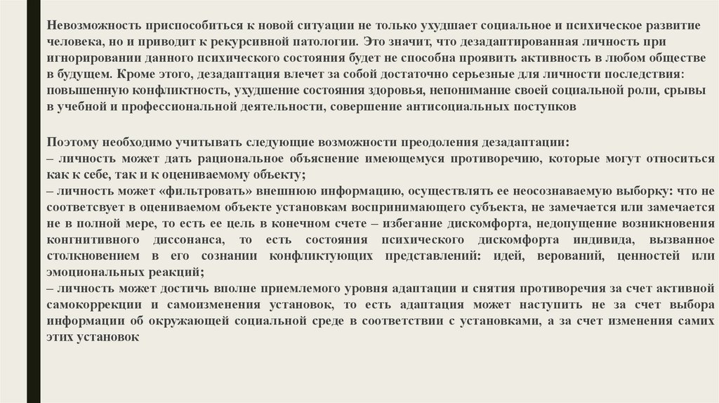 Невозможность приспособиться к новой ситуации не только ухудшает социальное и психическое развитиечеловека, но и приводит к рекурсивной патологии. Это значит, что дезадаптированная личность при