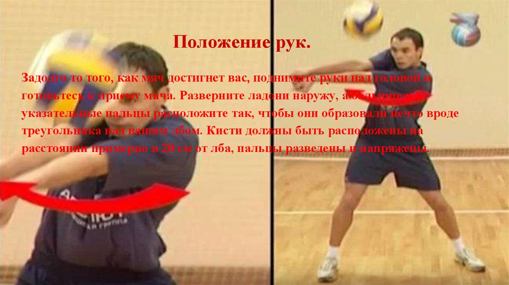 Положение рук.Задолго то того, как мяч достигнет вас, поднимите руки над головой и