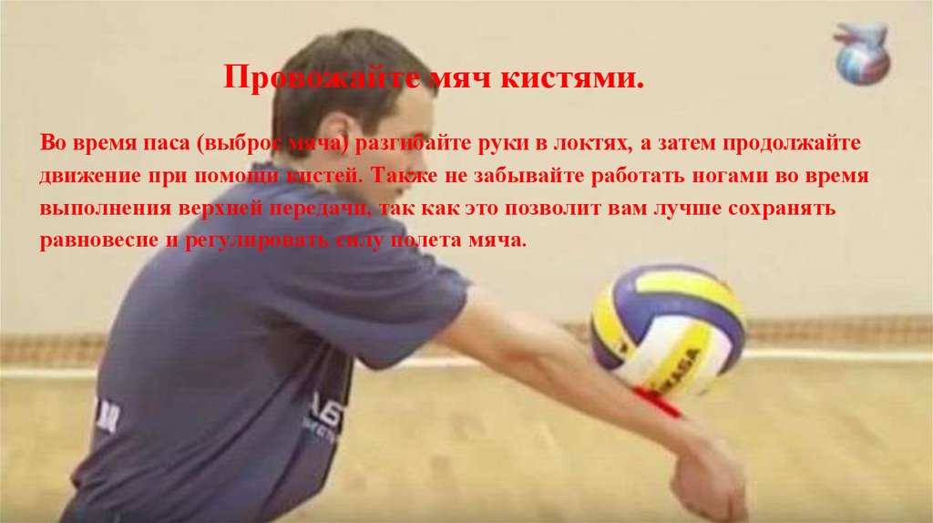 Провожайте мяч кистями.Во время паса (выброс мяча) разгибайте руки в локтях, а затем продолжайте