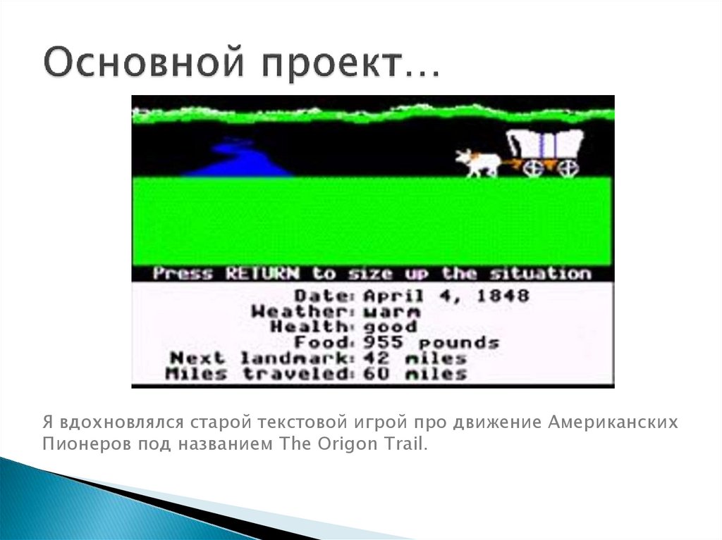 Я вдохновлялся старой текстовой игрой про движение АмериканскихПионеров под названием The Origon Trail.
