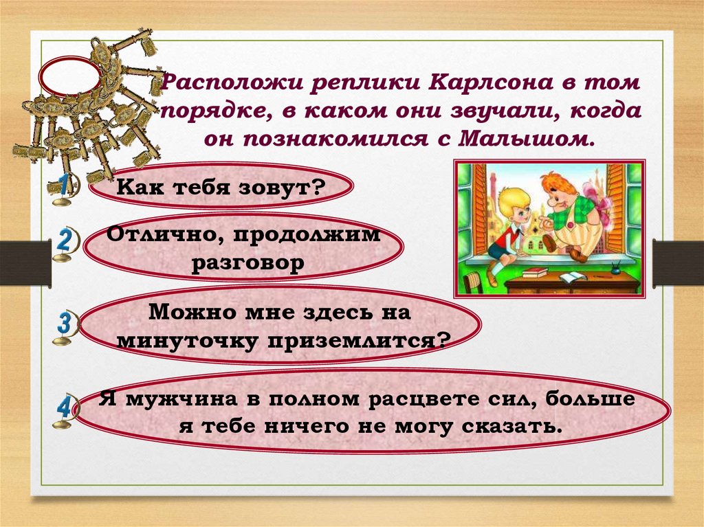 Расположи реплики Карлсона в томпорядке, в каком они звучали, когда