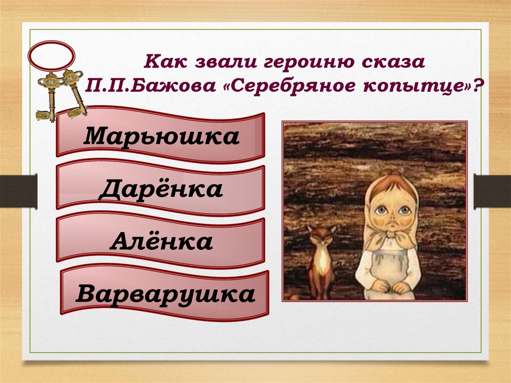 Как звали героиню сказаП.П.Бажова «Серебряное копытце»?