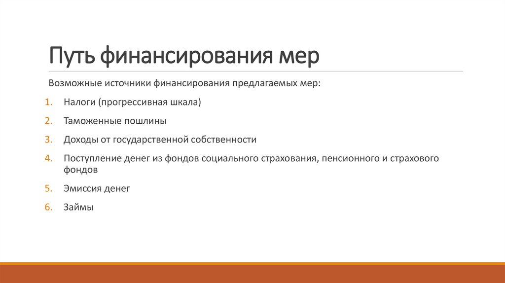 Путь финансирования мерВозможные источники финансирования предлагаемых мер: