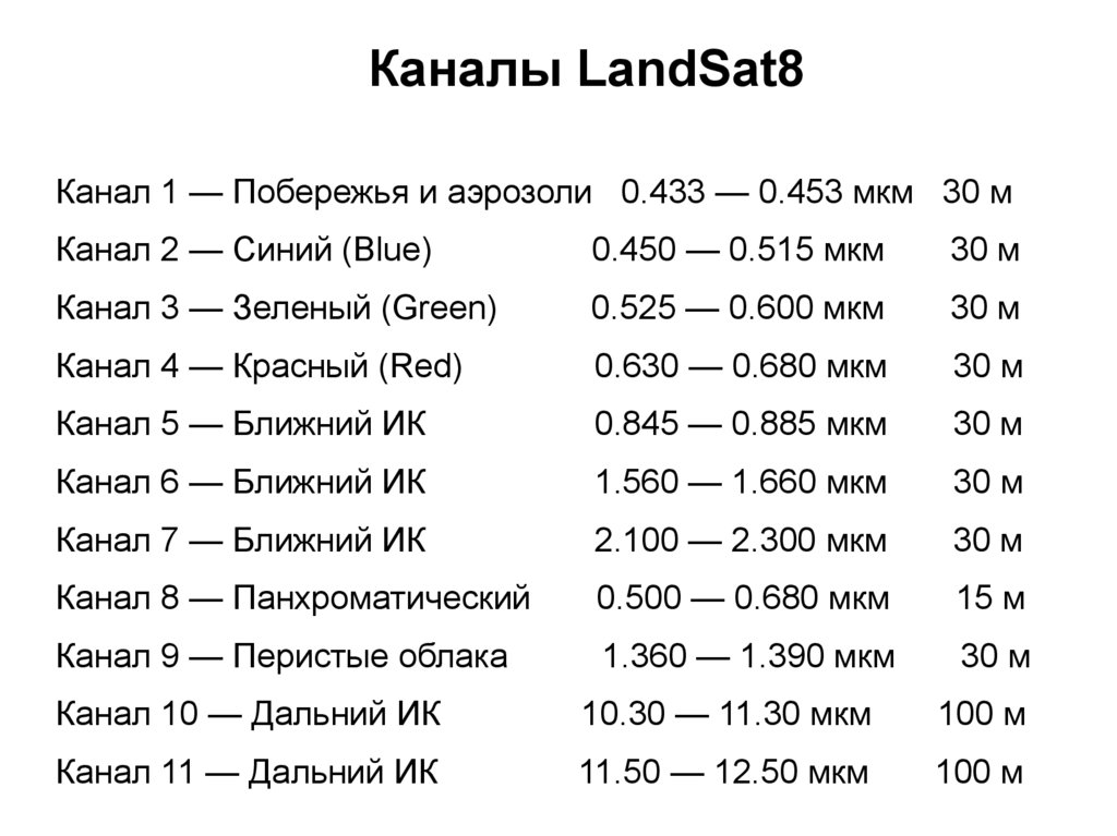 Каналы LandSat8Канал 1 — Побережья и аэрозоли 0.433 — 0.453 мкм 30 м
