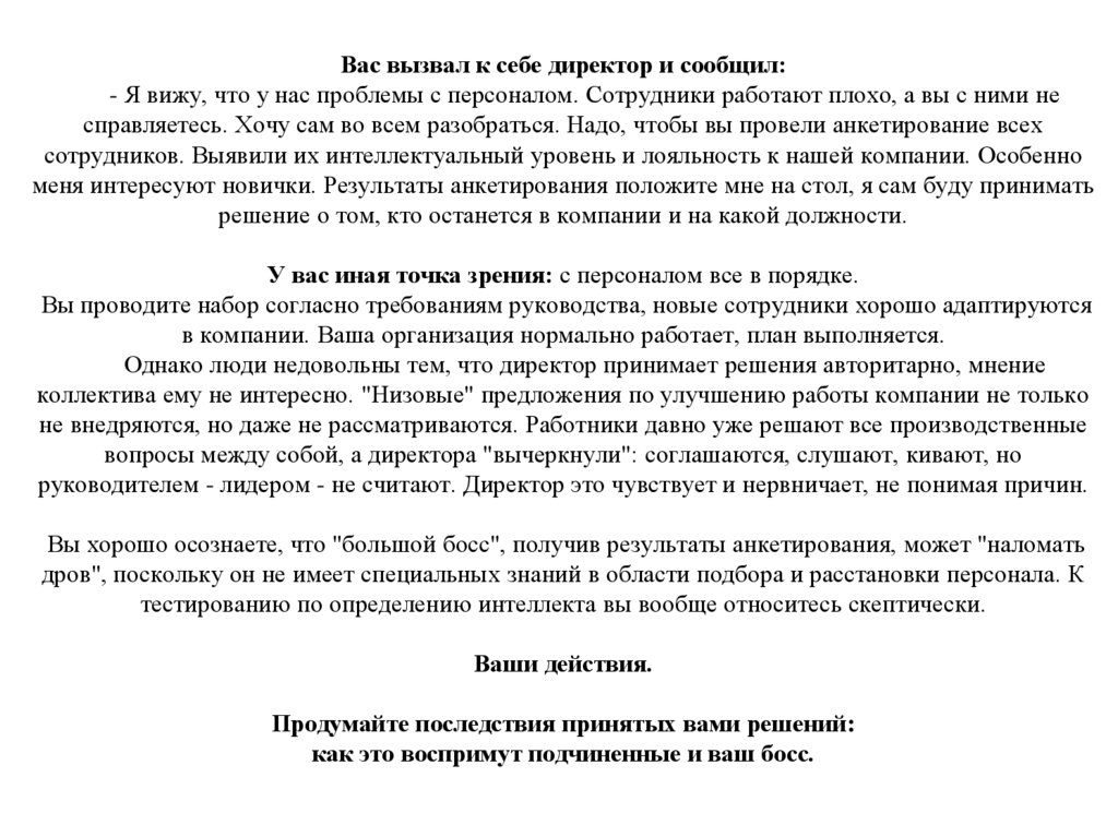 1. Вас вызвал к себе директор и сообщил: - Я вижу, что у нас проблемы с персоналом. Сотрудники работают плохо, а вы с ними не