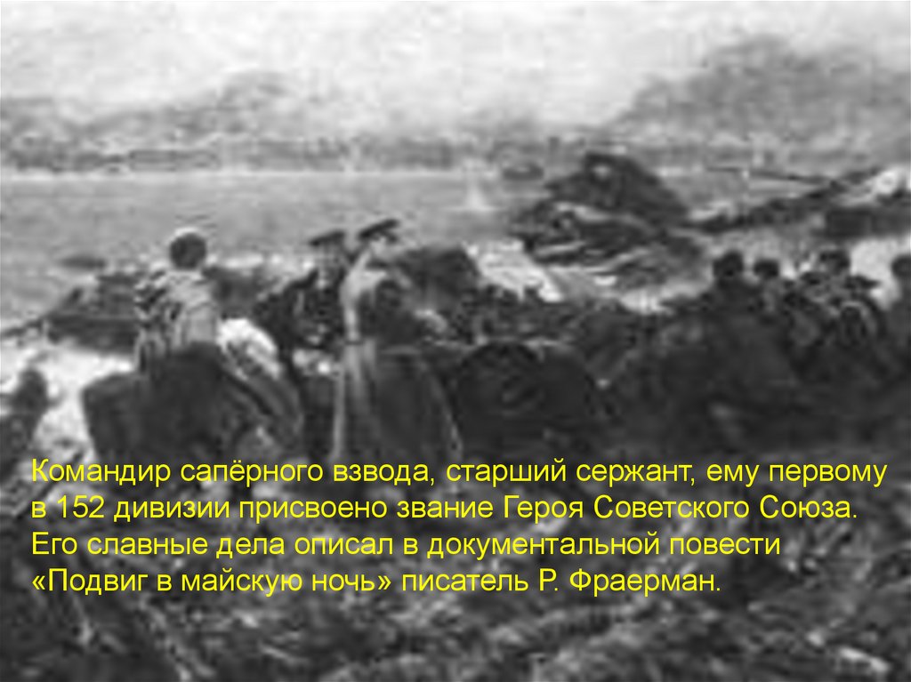 Командир сапёрного взвода, старший сержант, ему первомув 152 дивизии присвоено звание Героя Советского Союза.