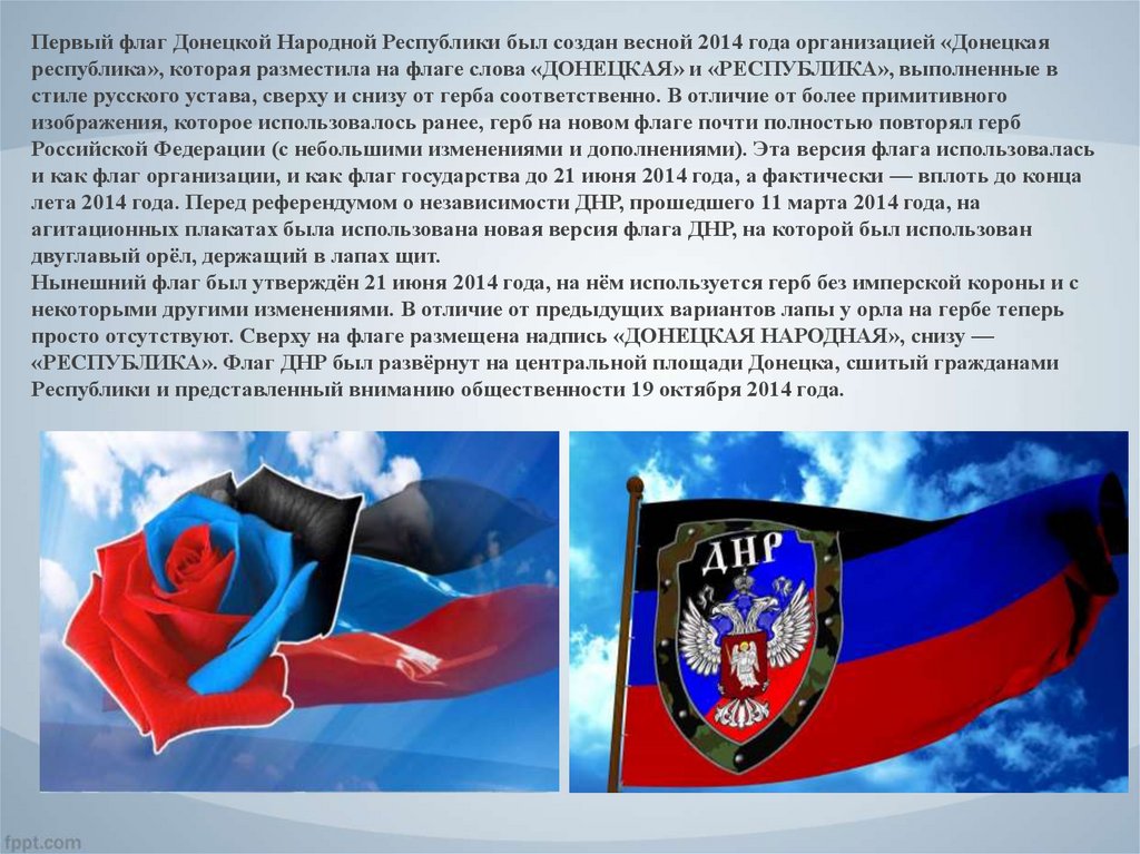 Первый флаг Донецкой Народной Республики был создан весной 2014 года организацией «Донецкаяреспублика», которая разместила на флаге слова «ДОНЕЦКАЯ» и «РЕСПУБЛИКА», выполненные в