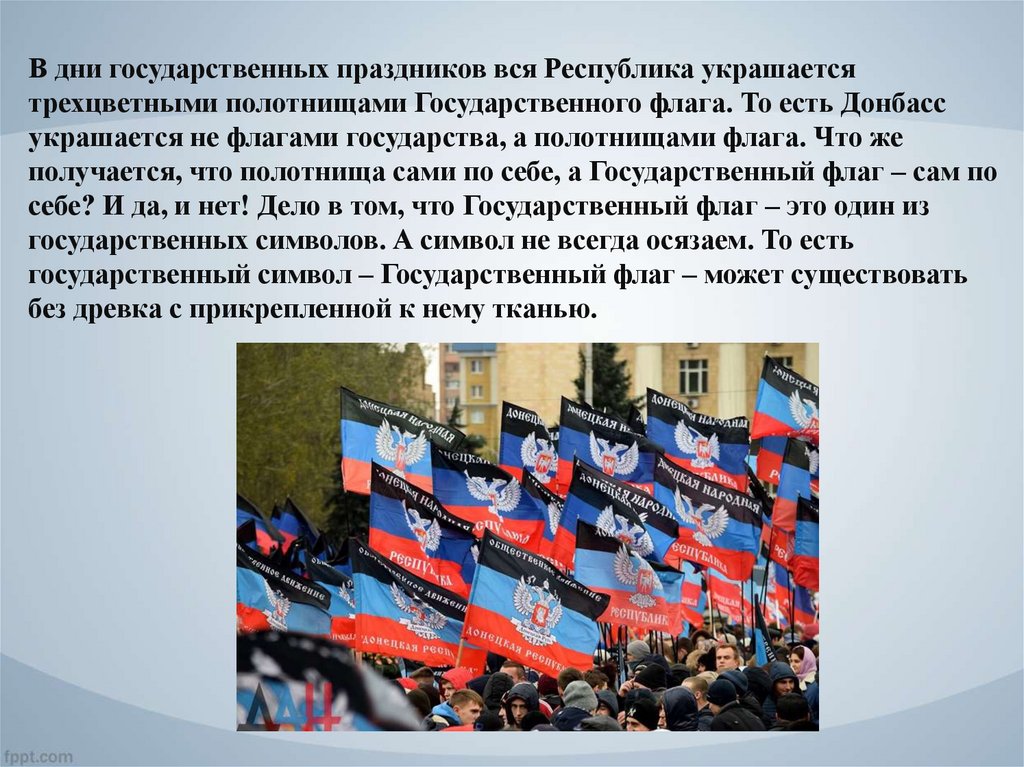 В дни государственных праздников вся Республика украшаетсятрехцветными полотнищами Государственного флага. То есть Донбасс