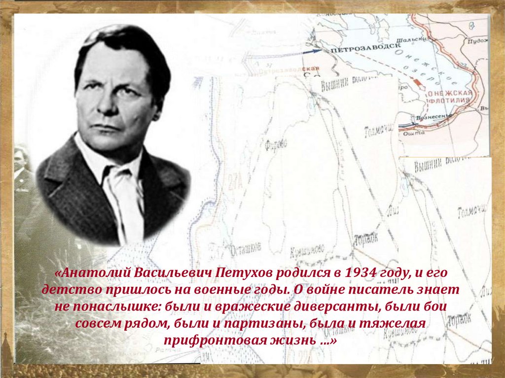 «Анатолий Васильевич Петухов родился в 1934 году, и егодетство пришлось на военные годы. О войне писатель знает