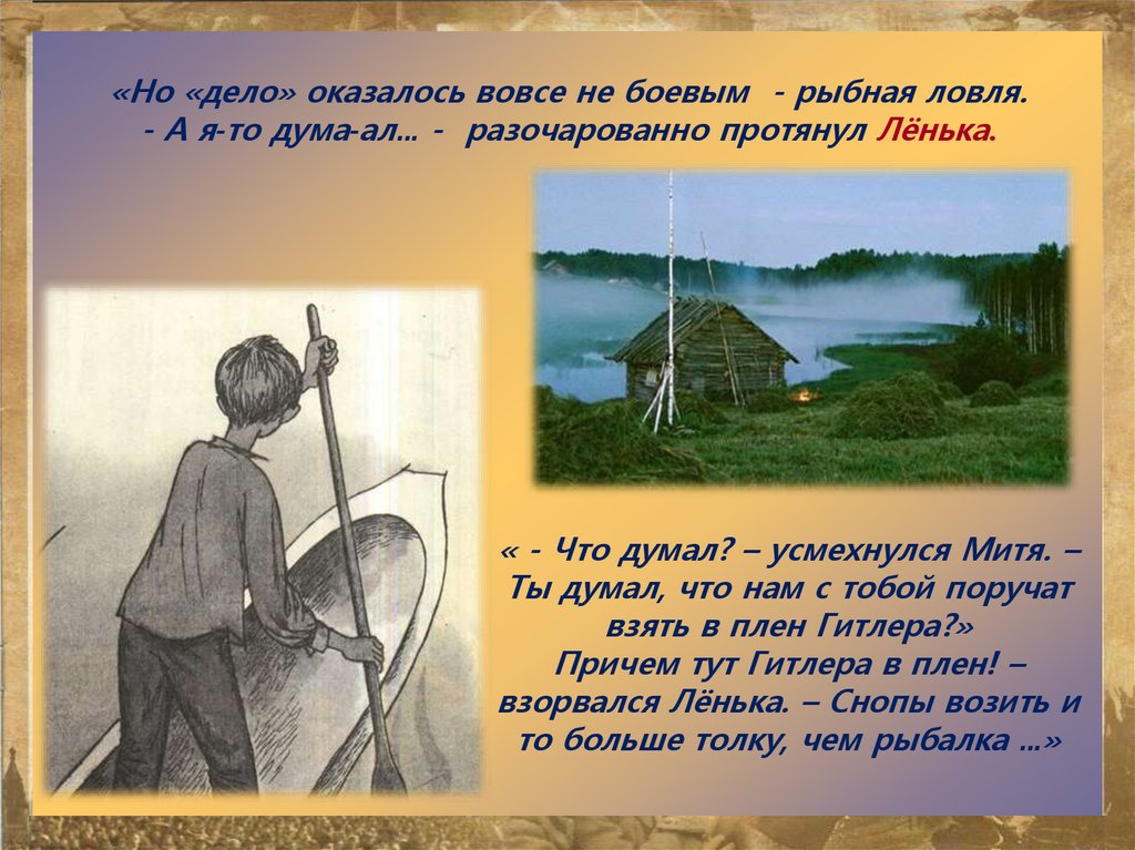«Но «дело» оказалось вовсе не боевым - рыбная ловля.- А я-то дума-ал… - разочарованно протянул Лёнька.