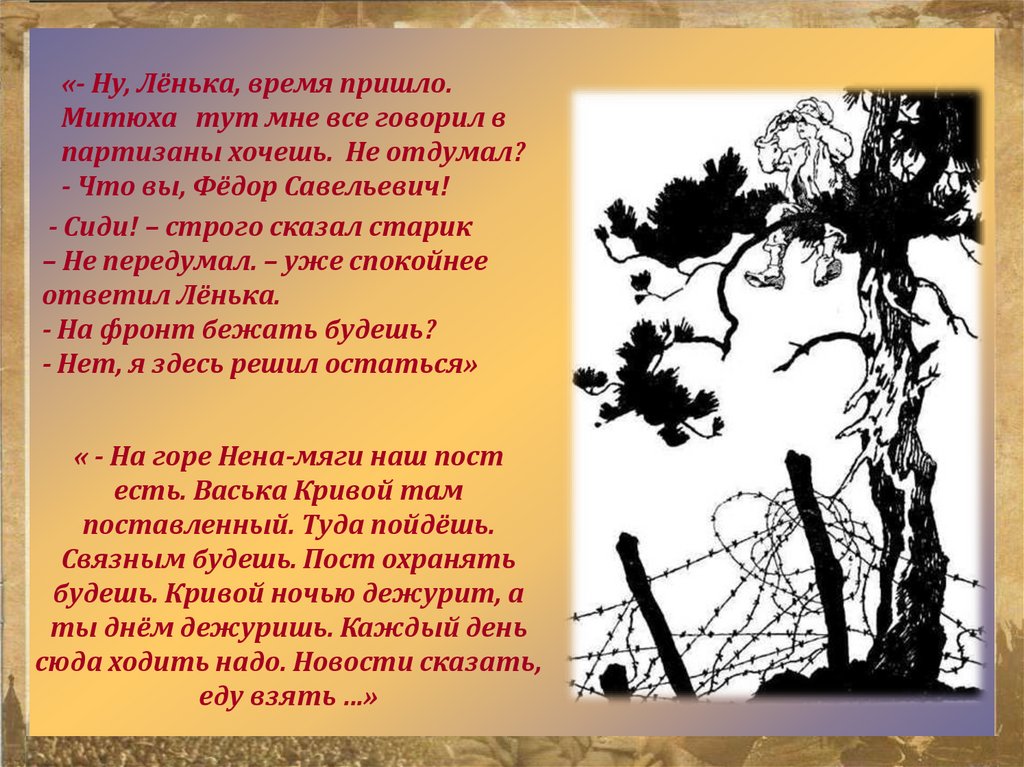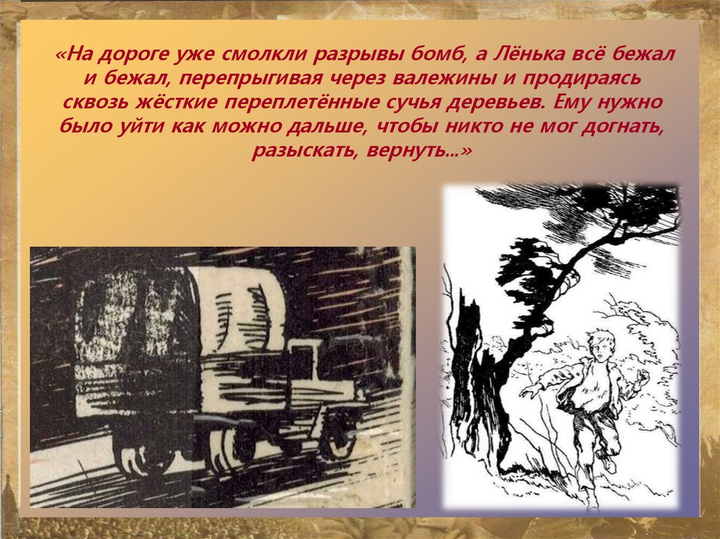 «На дороге уже смолкли разрывы бомб, а Лёнька всё бежали бежал, перепрыгивая через валежины и продираясь
