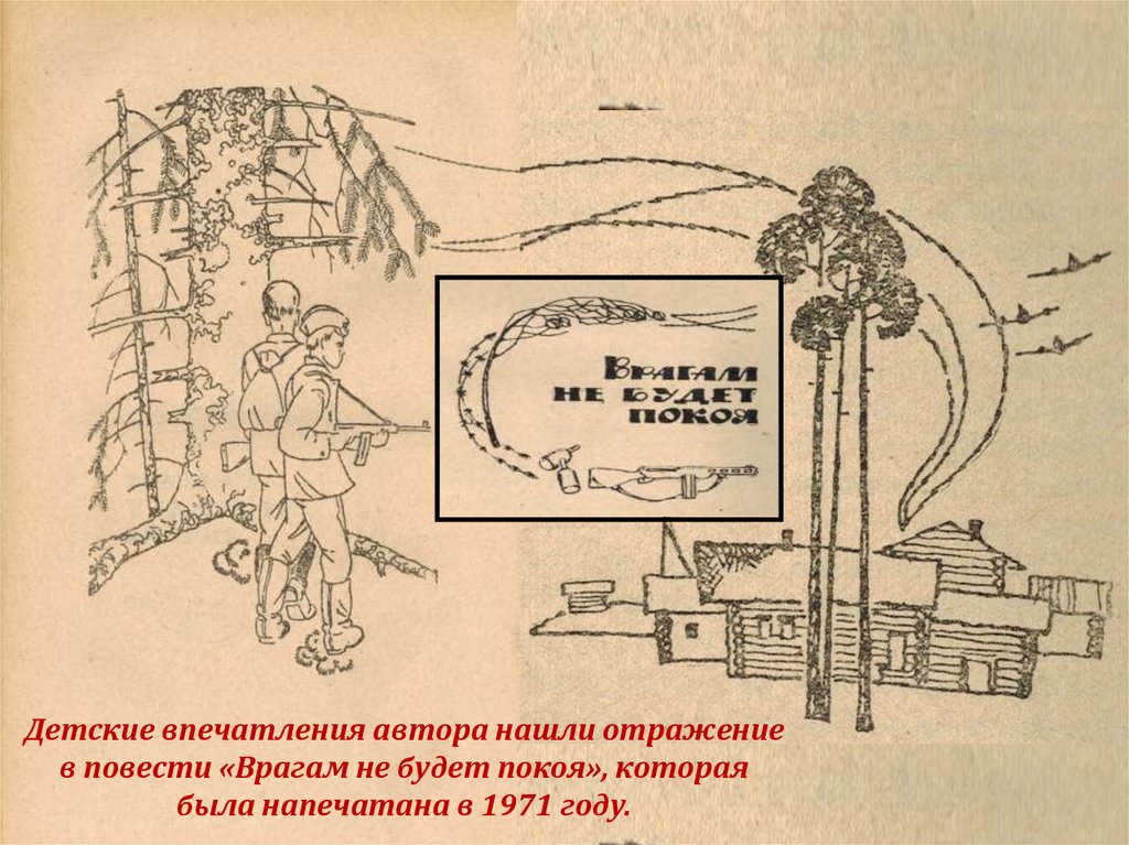 Детские впечатления автора нашли отражениев повести «Врагам не будет покоя», которая