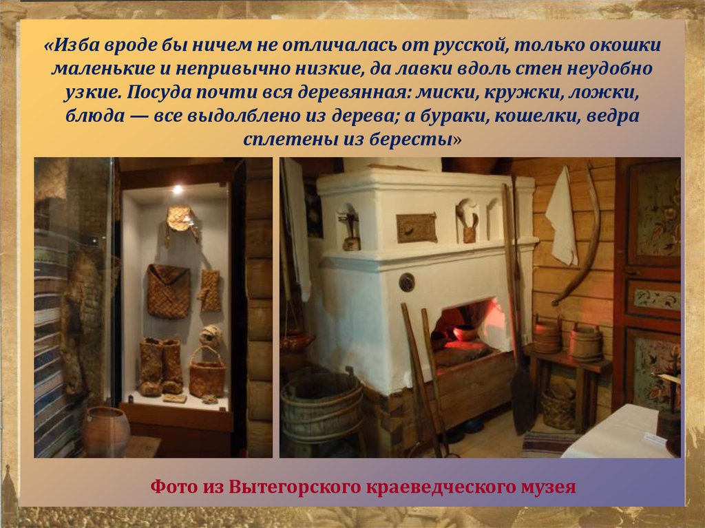 «Изба вроде бы ничем не отличалась от русской, только окошкималенькие и непривычно низкие, да лавки вдоль стен неудобно