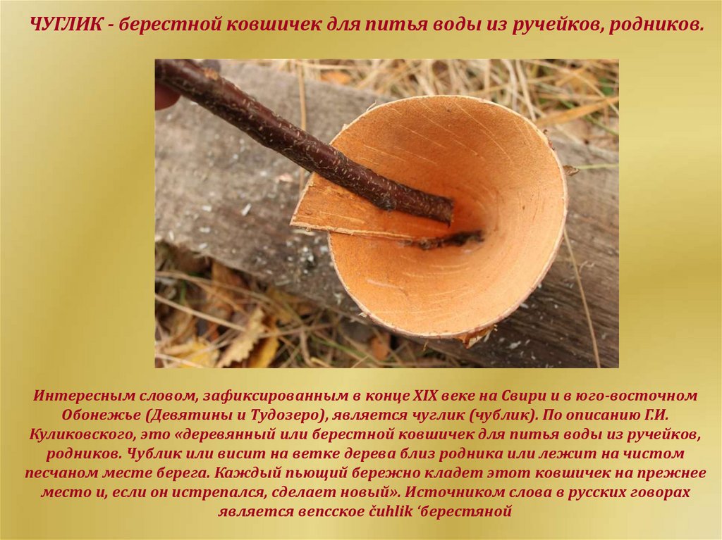 ЧУГЛИК - берестной ковшичек для питья воды из ручейков, родников.Интересным словом, зафиксированным в конце XIX веке на Свири и в юго-восточном