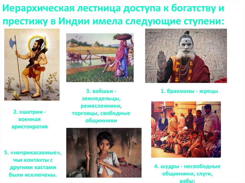 Иерархическая лестница доступа к богатству ипрестижу в Индии имела следующие ступени: