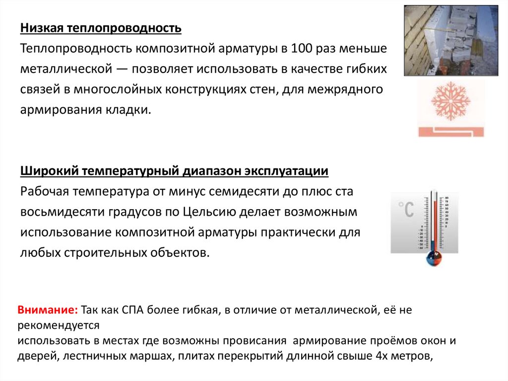 Низкая теплопроводностьТеплопроводность композитной арматуры в 100 раз меньше